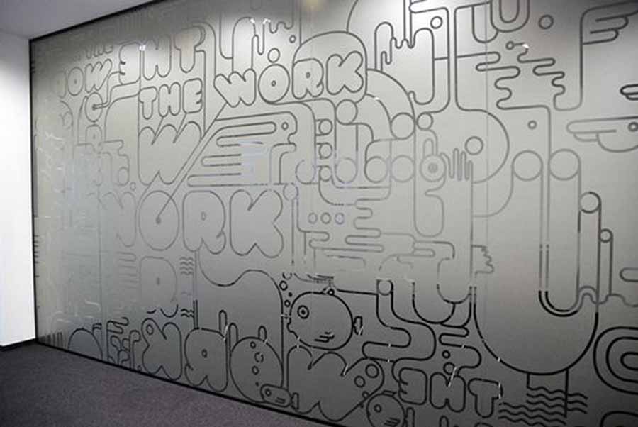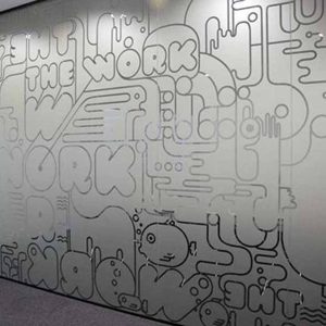 Ofrecemos viniles esmerilados, murales corporativos y mensajes de cultura alineados a tu arquitectura.